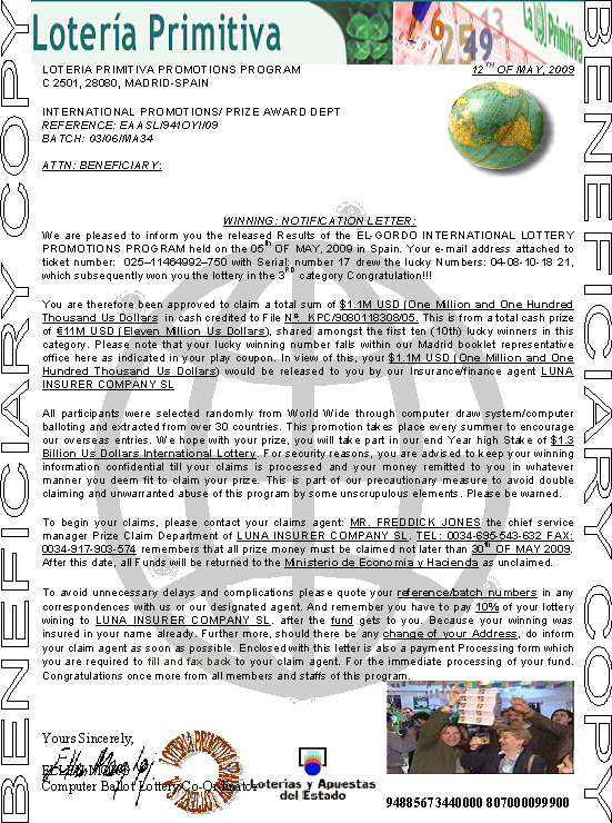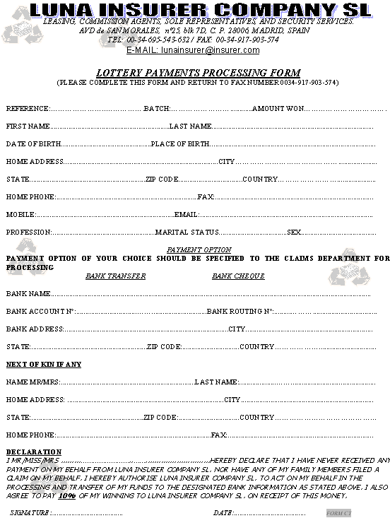 NOTIFICATION LETTER AND THE LOTTERY PAYMENT PROCESSING FORM WHICH YOU ARE