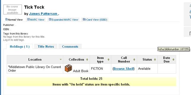 One thing I can’t seem to find: on the OPAC, display the number of holds on a title from the first screen:
